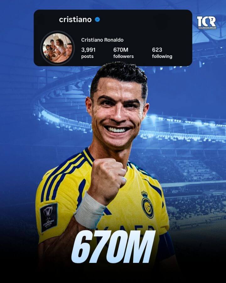 Số người theo dõi Ins của C.Ronaldo chính thức vượt 670 triệu, trở thành cầu thủ đầu tiên đạt cột mốc này.