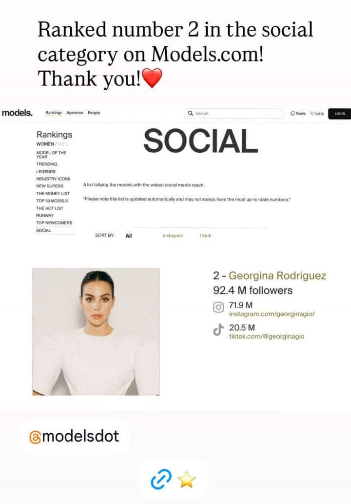 Ngày 15/1, Georgina đã cập nhật mạng xã hội và chia sẻ bảng xếp hạng người theo dõi của mình. Theo trang models, cô đứng thứ hai ở hạng mục Social, cho thấy sức ảnh hưởng cực lớn. Hiện tại, tổng lượng người theo dõi trên các nền tảng của Georgina đã đạt 92,4 triệu. Trong đó, Instagram gần 71,9 triệu fan, còn TikTok cũng vượt mốc 20,5 triệu. Một con số đủ để khẳng định vị thế “top đầu” của cô trên mạng xã hội.