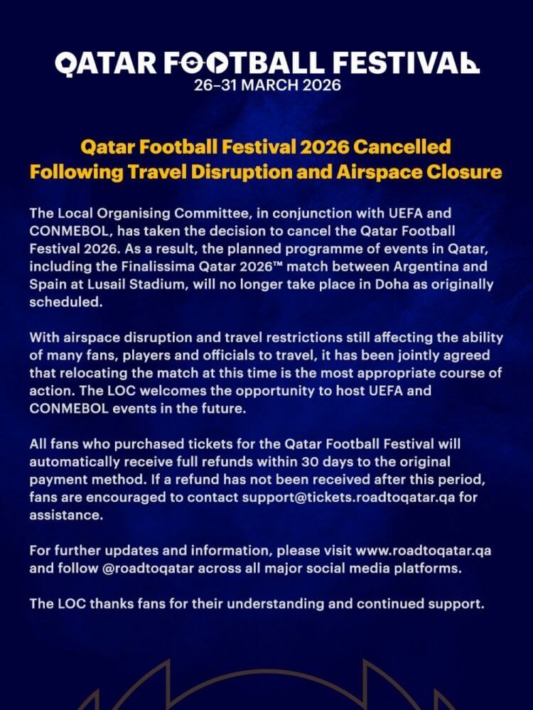 Theo giờ địa phương ngày 16/3, Ban Tổ chức địa phương sau khi thảo luận với UEFA và CONMEBOL đã quyết định hủy Lễ hội Bóng đá Qatar 2026. Do đó, chuỗi hoạt động dự kiến diễn ra tại Qatar, bao gồm trận đấu giữa Argentina và Tây Ban Nha thuộc Cúp Âu – Mỹ 2026 tại Sân vận động Lusail, sẽ không diễn ra theo kế hoạch tại Doha.