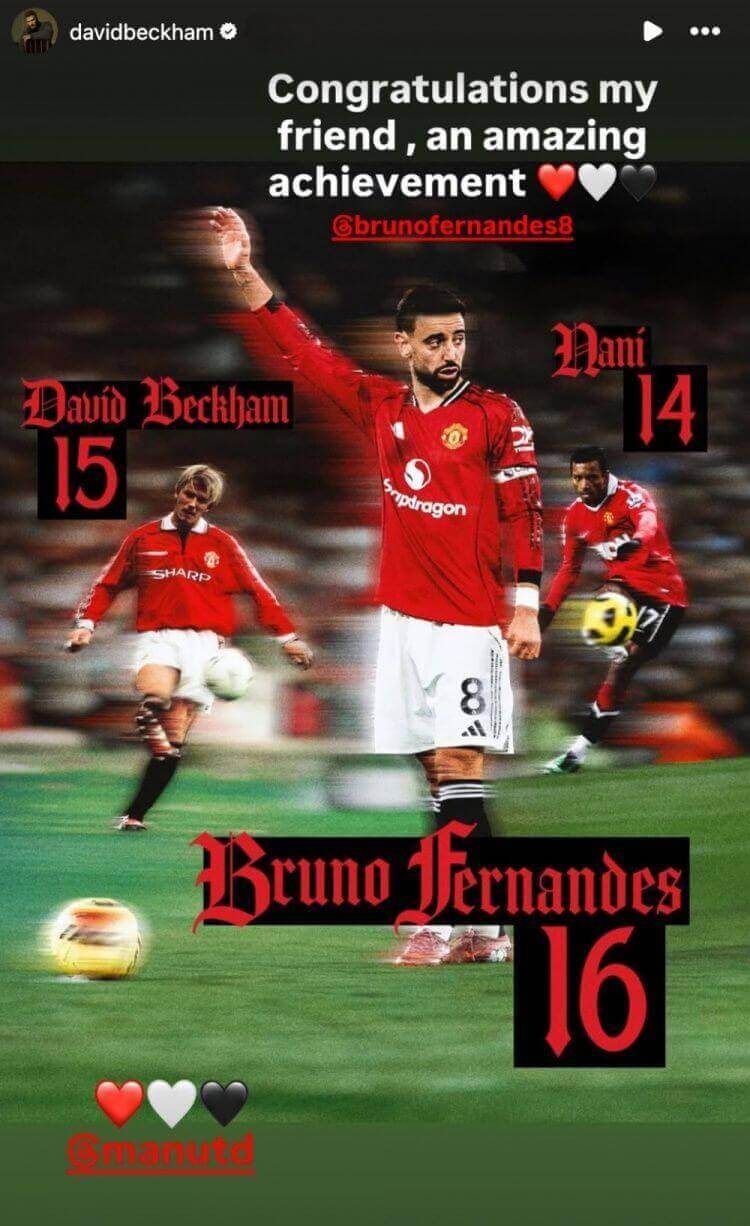 Beckham cũng đăng lên mạng xã hội để chúc mừng đàn em, với dòng trạng thái: “Chúc mừng bạn của tôi, đây là một thành tích thật đáng kinh ngạc ❤️🤍🖤”. Không chỉ vậy, ông còn ghép hình B. Fernandes vào chiếc áo truyền thống của Man United kèm dòng chữ “Kỷ lục mới! ❤️🤍🖤”, tràn đầy tình cảm và sự ghi nhận!