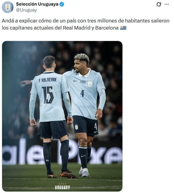 Ngày 29/03, trang mạng xã hội chính thức của đội tuyển Uruguay đăng tải hình ảnh Ronald Araujo và Federico Valverde, nhanh chóng thu hút sự chú ý. Dòng trạng thái đầy tự hào: “Hãy thử giải thích xem, một quốc gia chỉ có 3 triệu dân làm thế nào lại đào tạo ra đội trưởng của Real Madrid và Barcelona?”