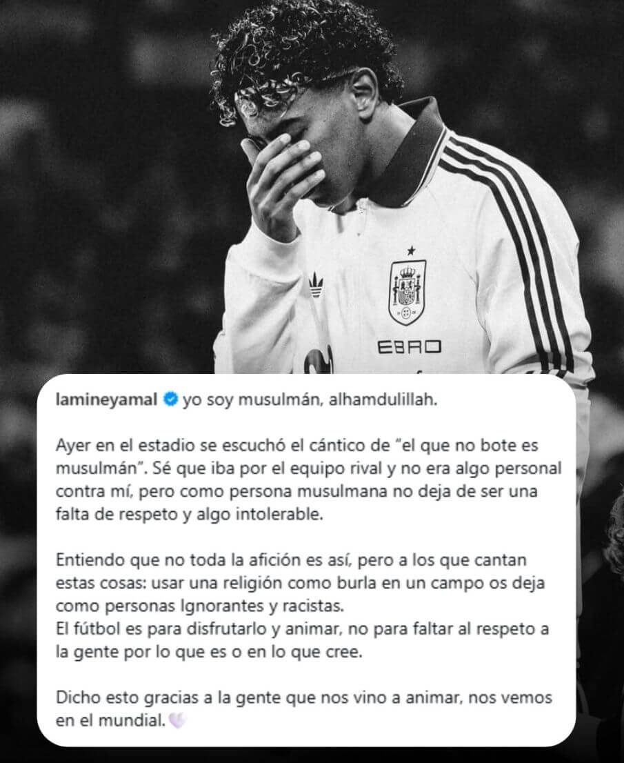Yamal viết: “Tôi là người Hồi giáo, tạ ơn Allah.” Anh cho biết đã nghe thấy khẩu hiệu “ai không nhảy là người Hồi giáo” trong trận đấu. Dù hiểu rằng đây có thể là cách cổ vũ nhằm vào đối thủ, nhưng với anh, điều đó vẫn là thiếu tôn trọng và không thể chấp nhận.