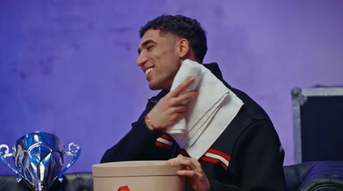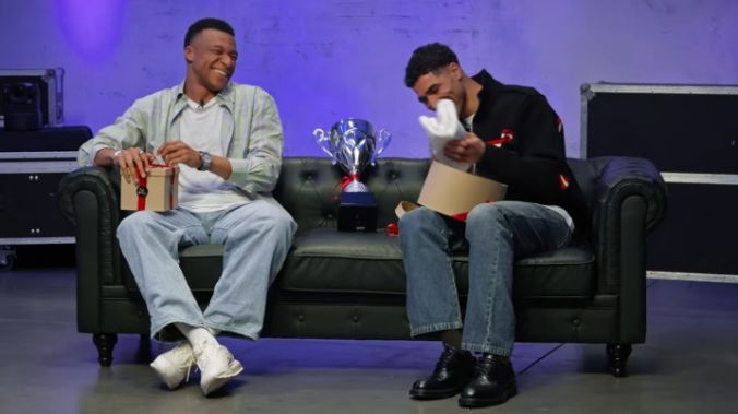Sau đó Tchouaméni ra hiệu cho Hakimi mở hộp xem món quà bên trong là gì, và nói rằng nó sẽ rất hợp với chiếc cúp.